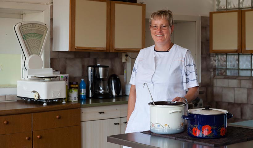 Nach dem Abschluss ihrer Lehre arbeitete Heike Möller zehn Jahre lang in der LPG, danach in anderen Betrieben. Seit gut einem Jahr ist sie nun wieder zurück. »Endlich habe ich wieder eine Arbeit vor Ort«, freut sie sich, »ich habe keine Schichten mehr und bin hier in der Küche mein eigener Chef.« Für rund 30 Leute bereitet sie täglich das Mittagessen zu.